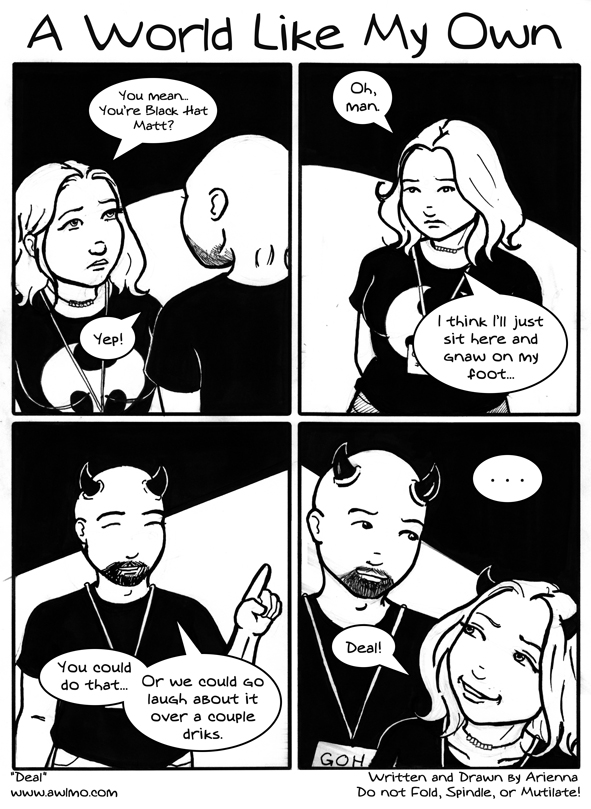 AriennaThis comic has had more stuff spilled on it than almost any other comic I've ever drawn. o.O Water, soda, soup.. Gah! I had to set up the light table and redraw it. The Guide's coming. As I work on it, I keep wanting to rewrite the words and grab more pictures and rearrange it. It's all getting a little exhausting. |