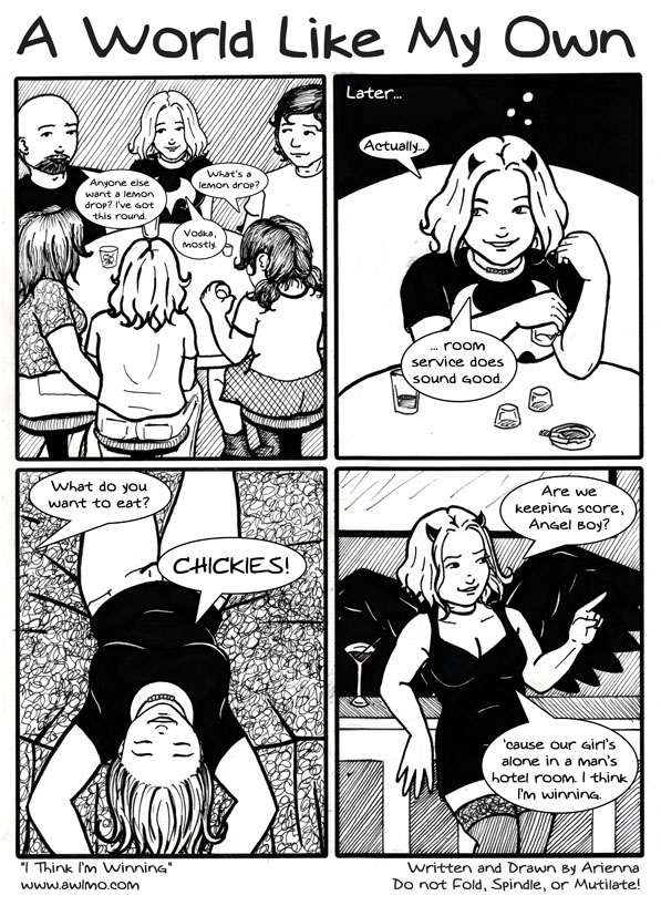 AriennaWell... well... Hoo boy. It's been a month. Not the best or prettiest month of my life, but I'm back. I'm missed you all very, very much. And as an attempt to apologize for my absence, I give you... Devil Girl In A Tight Black Dress. I've also posted an unlettered copy of the fourth panel as an incentive pic - go vote! ^_^ |