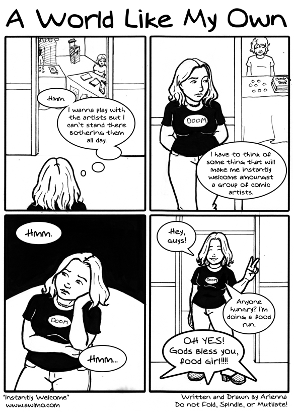 Well. Well, well. 200 comics. It's been an interesting journey, hasn't it? A lot of things have happened since I first started drawing this as a joke to entertain my roommate. I think it's safe to say that now-a-days my whole life centers around this comic. I work so I can come home and draw. Every day things happen and I take mental notes saying, "That'll make a funny comic..." AWLMO is the most important thing about myself I always want to share with other people. "What do you do?" they ask. "Well, I'm an artist! I draw an online comic about my life!" I love drawing this comic and I want to keep drawing and getting better at drawing it and telling stories for a long time. AWLMO isn't about telling silly stories to amuse my roommate anymore. This is me. When you visit AWLMO and read the comics, I'm throwing open the doors and inviting you into my life. These are my stories, these are who I am. It's a little funny, a little sad, and utterly true.
