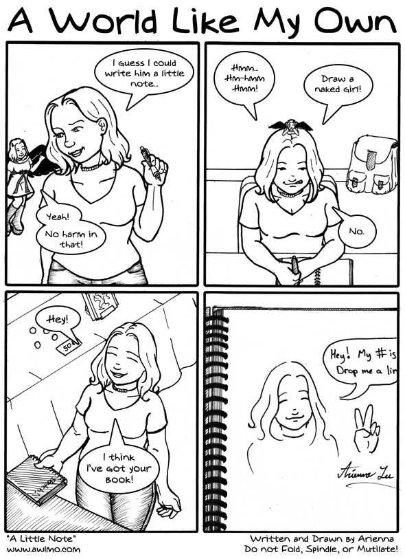 AriennaIt is a comic! Now I must go take a shower and get lots of sleep so I can go to work and then go larping! ^_^ See you all Monday! Also, yeah, I really did this. I was all jittery and shy but I wanted to get in touch with him so I borrowed his sketchpad to look at his drawings and left him a doodle with my number and e-mail address. Grace and subtlety thy name is Arienna. |