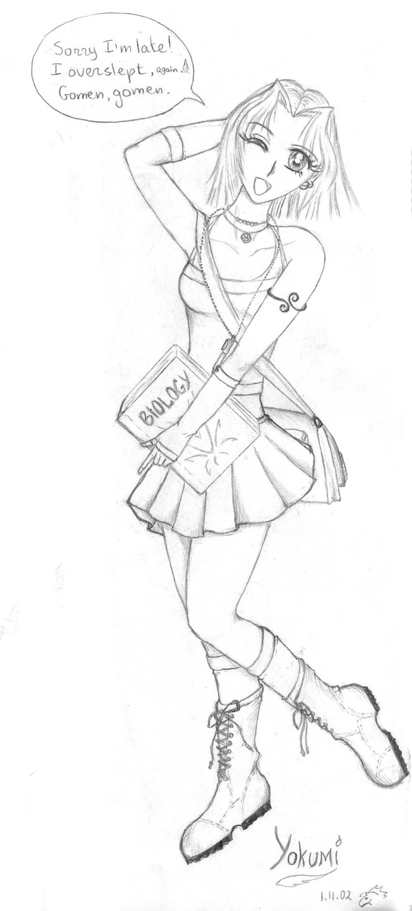 This sketch is the original character sketch for my character, Yokumi-chan (which is what my friends often called me in high school). And... that's a pretty accurate depiction of high school Arie. ^_^ Drawn, of course, by the lovely and talented Sumire-chan. <3