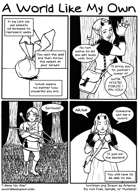 AriennaMuahaha! Significantly less late today! Unfortunately I'm all set to spend my day off in the wonderfully distracting company of a very charming gentleman. I... don't expect to get much drawing done. ^_^ This is comic is about the live-action role-playing game (LARP!) I play called NERO. There will be a number of larp related comics over the next while. ^_^ |