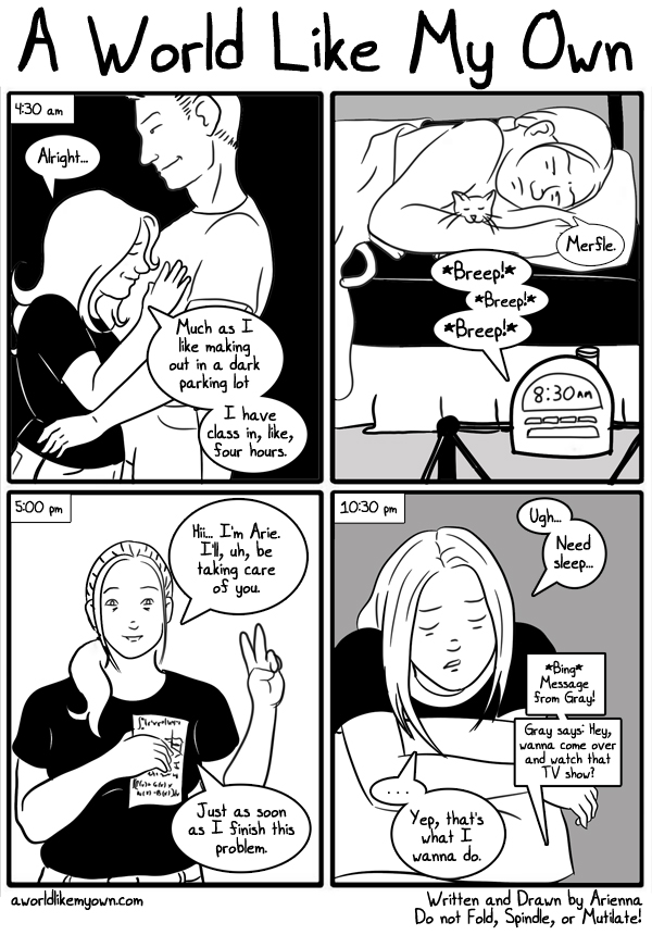 AriennaHah! Another comic. The new semester is roaring around here. Two weeks in and I'm already feeling swamped and crazy. But I'm learning really interesting things, and I'm working hard. Wish me luck! |