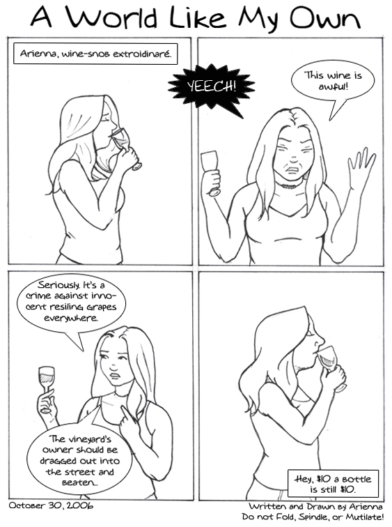 Heh, okay... I enjoy decent rotgut wines. Back home in Michigan I knew several $10-15 wines that were really very good, despite their low cost. Almost all of them are white wines (Reds don't do well cheap, I don't know enough to know why), and I'm particularly fond of reislings, being light and fruity and sweet and very unfrightening. Unfortunately, here in NC, the local gorcery store only carries local, Australian, and Italian wines. I kid you not. I don't know -any- of these names. So every couple of weeks, I go play roulette in the "fine wine" aisles, trying to find a decent wine.